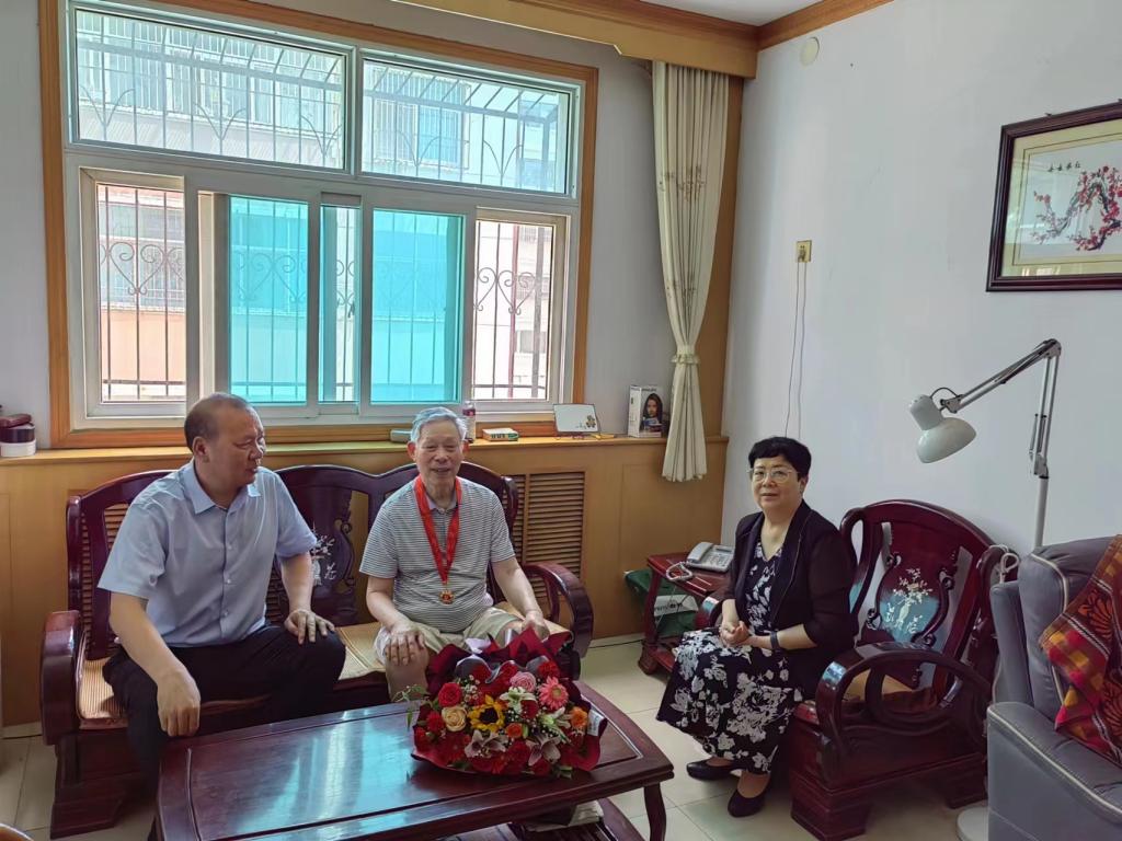 我校开展走访慰问离退休老干部和颁发老党员“光荣在党50年”纪念章活动为庆祝中国共产党成立102年周年,学校党委开展了走访慰问离退休老干部并向老党员颁发“光荣在党50年”纪念章活动。6月30日上午,党委委员、工会主席吕爱华、工会副主席张和平及负责老干部工作相关人员到退休老干部王增卷家走访慰问。在老党员王增卷的家中,为其颁发了“光荣在党50年”纪念章。党委委员吕爱华代表学校领导班子向老党员们致以节日的问候,并...