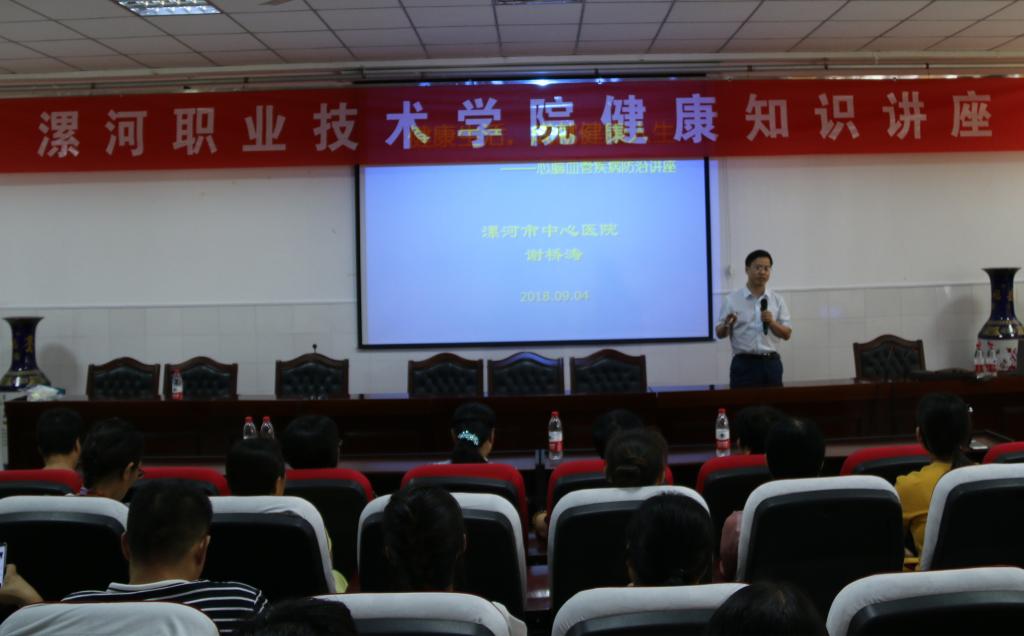 为迎接第34个教师节,9月4日下午,院工会携手市卫计委健康教育所和中心医院举办“健康生活成就健康人生”健康知识讲座。漯河市中心医院高血压科副主任谢桥涛教授主讲。院工会主席吕爱华、市健康教育所及学院21个分工会近200名教职工出席讲座。工会副主席叶桂娥同志主持讲座。