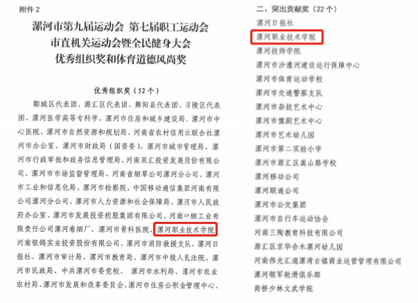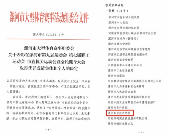 近日,漯河市大型体育赛事组委会发布关于表彰在漯河市第九届运动会 第七届职工运动会 市直机关运动会暨全民健身大会取得优异成绩集体和个人的决定。OK138太阳集团积极参赛并取得良好成绩,荣获优秀组织奖、突出贡献奖以及一等奖3项、二等奖2项。