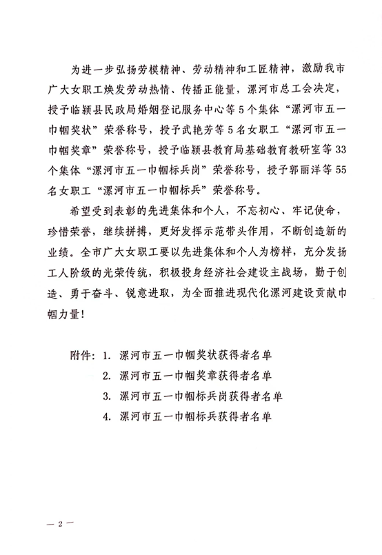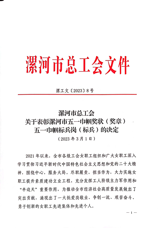 为深入学习贯彻党的二十大精神,大力弘扬劳模精神、劳动精神、工匠精神,团结动员广大女职工为全面建设社会主义现代化国家、全面推进中华民族伟大复兴贡献力量,3月14日上午,漯河市总工会女职工委员会五届三次会议暨五一巾帼奖表彰大会在市科教文化艺术中心一楼报告厅召开。会议表彰了荣获五一巾帼奖状、五一巾帼奖章等荣誉称号的先进集体和个人。我院教师孙冬玲荣获 “漯河市五一巾帼标兵”荣誉称号。
