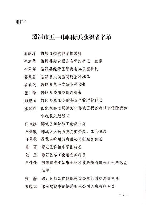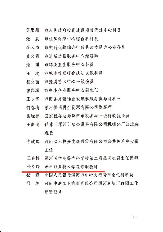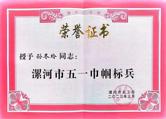 我院教师孙冬玲荣获“漯河市五一巾帼标兵”荣誉称号