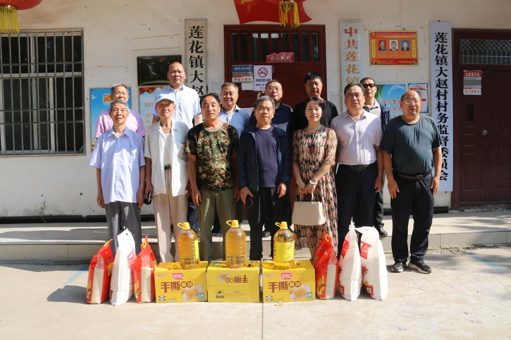 站在几个月前举办过” 油菜花节” 曾经召来多家新闻媒体纷纷釆访报道过的我院驻村点儿——舞阳县莲花镇大赵村段的澧河堤上,举目眺望沿岸庄稼长势喜人, 新植的桃树苗儿葱茏翠绿, 枣树苗儿茁壮旺盛, 真是绿色满眼拌两岸啊。在37度的高温下,专程前来慰问驻村笫一书记和村里困难群众的学院工会党总支书记和离退休党支部书记等一行十多人走在平坦干净的水泥混凝土村道上,边参观村容村貌边与村书记交谈,喜悦之情意于言表。在村委会议室,前来慰问领导和退休干部们认真听取村情介绍、发展变化、取得成绩和未来规划;细看村里所获得的各类奖牌,大家称赞有嘉,对大赵村的幸福未来充满信心。