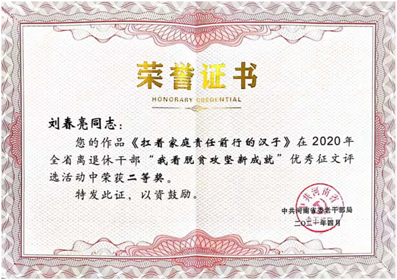我校退休教师、老党员刘春亮同志退休不退岗,笔耕不辍,积极宣传党和国家大政方针,传递正能量。他的作品《扛着家庭责任前行的汉子》在中共河南省委老干部局组织的2020年全省离退休干部“我看脱贫攻坚新成就”优秀征文评选活动中荣获二等奖,在此特别祝贺,也希望广大退休教师向刘春亮同志学习,不忘初心使命,继续发挥余热